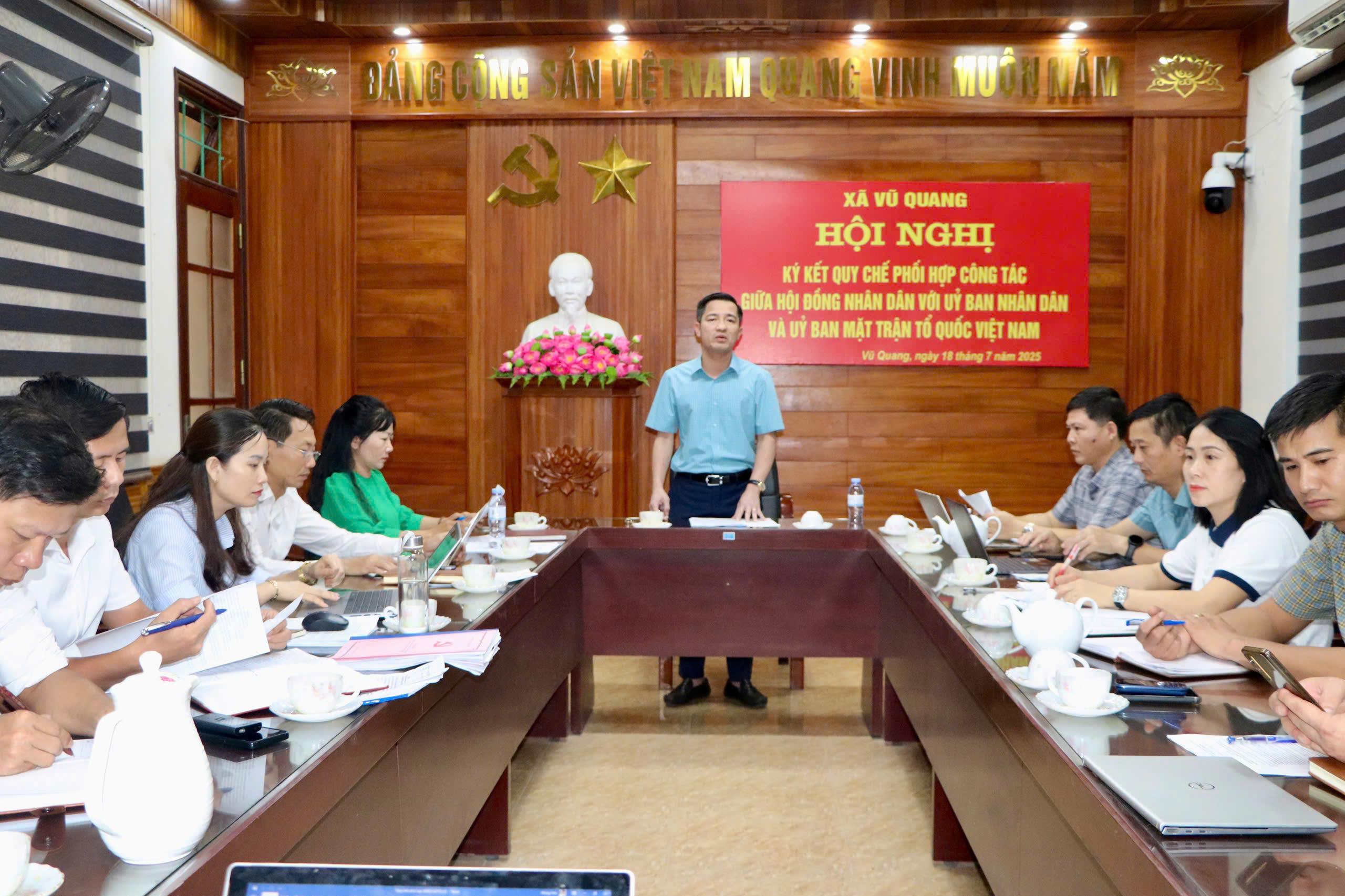 Chiều ngày 18/7, Thường trực Hội đồng nhân dân (HĐND) xã Vũ Quang đã tổ chức họp soát xét công tác chuẩn bị kỳ họp thường lệ giữa năm 2025, Hội đồng nhân dân xã khóa I, nhiệm kỳ 2021-2026. Bí thư Đảng ủy, Chủ tịch Hội đồng nhân dân xã Vũ Quang Trần Nguyên Thọ chủ trì hội nghị.