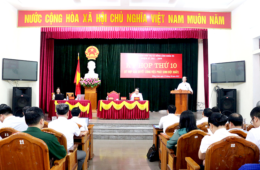 Sáng 31/10/2022, Hội đồng nhân dân (HĐND) thị xã Hồng Lĩnh đã tổ chức kỳ họp thứ 11 (kỳ họp giải quyết công việc phát sinh đột xuất) để bàn bố trí vốn từ nguồn ngân sách thị xã cho công trình đường Nguyễn Thiếp (giai đoạn 1). Chủ tịch HĐND thị xã Nguyễn Thăng Long và Phó Chủ tịch HĐND thị xã Nguyễn Quang Vinh chủ trì kỳ họp.