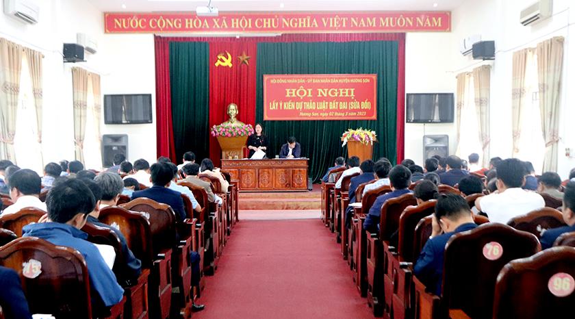 Chiều ngày 2/3/2023, HĐND - UBND huyện Hương Sơn đã tổ chức họp lấy ý kiến về dự thảo Luật Đất đai (Sửa đổi). Đồng chí Hà Thị Huyền - UVBTV, Phó Chủ tịch HĐND huyện, đồng chí Trần Bình Thân - Phó Chủ tịch UBND huyện đồng chủ trì cuộc họp.