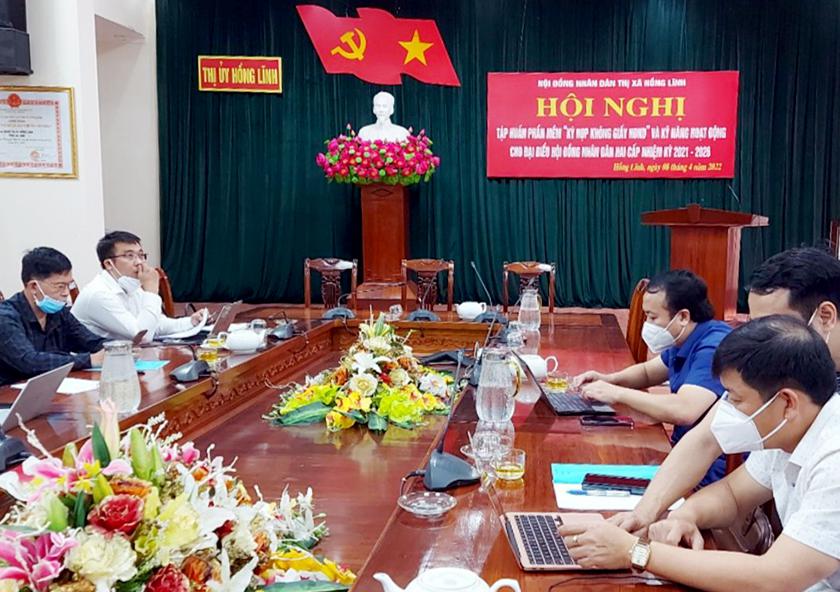 Sáng ngày 08.4.2022, Thường trực Hội đồng nhân dân (HĐND) thị xã Hồng Lĩnh phối hợp Văn phòng Đoàn đại biểu Quốc hội và HĐND tỉnh, Công ty Cổ phần tin học Tân Dân tổ chức tập huấn triển khai phần mềm “Kỳ họp không giấy ” cho các đại biểu HĐND thị xã khóa VII.