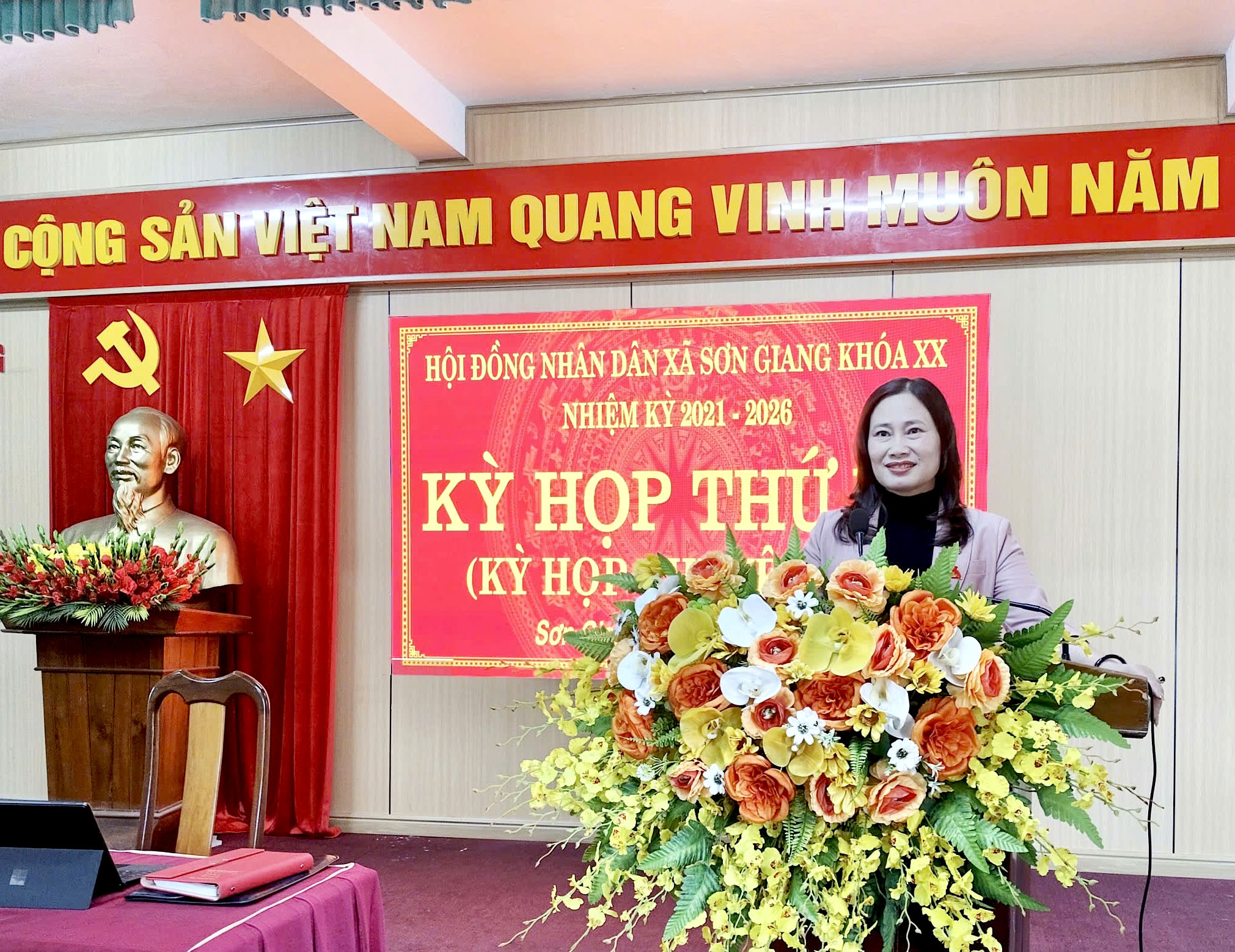 Bí thư Đảng ủy, Chủ tịch HĐND xã Sơn Giang Hà Thị Huyền phát biểu tại kỳ họp.