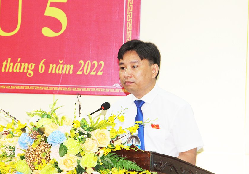 Phó Chủ tịch UBND huyện Hoàng Xuân Hùng báo cáo kết quả thực hiện ké hoạch kinh tế - xã hội 6 tháng đầu năm; phương hướng nhiệm vụ 6 tháng cuối năm 2022 |