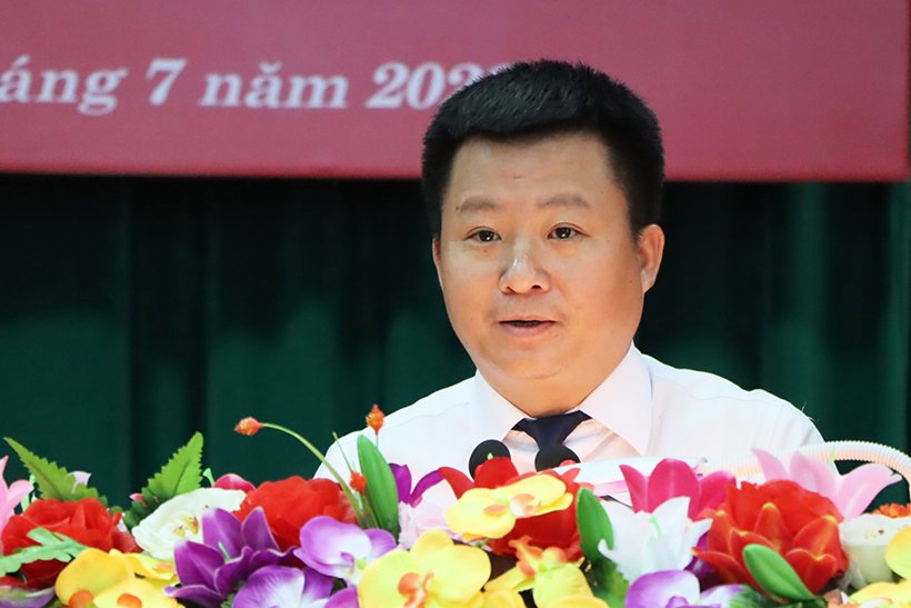 | Phó Chủ tịch UBND huyện Phạm Hoàng Anh trình bày báo cáo đánh giá tình hình KT-XH, QP-AN 6 tháng đầu năm và nhiệm vụ, giải pháp 6 tháng cuối năm 2022 |