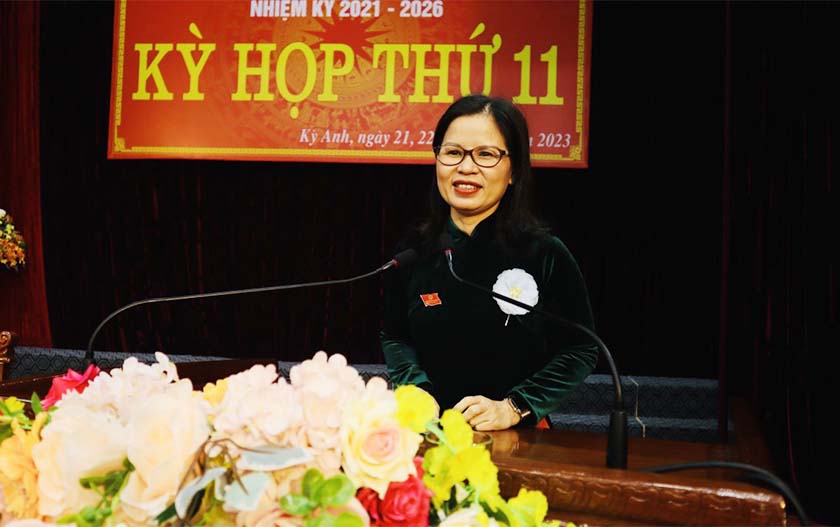 | Phó Chủ tịch UBND huyện Kỳ Anh Dương Thị Vân Anh báo cáo về tình hình phát triển KT-XH năm 20203 và giải pháp, nhiệm vụ năm 2024 |