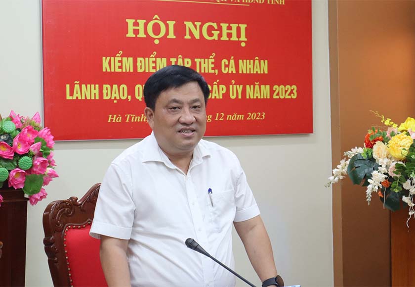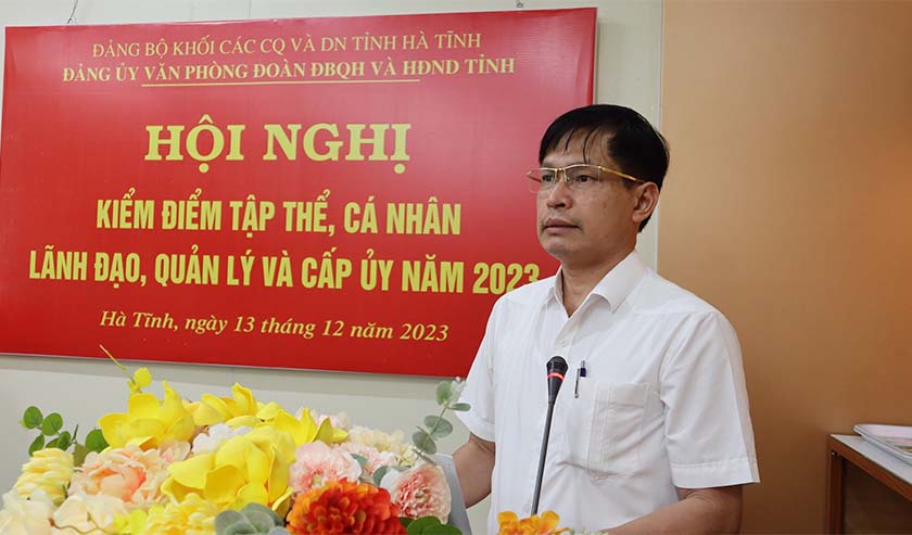 | Phó Bí thư Đảng ủy, Chủ nhiệm Ủy ban Kiểm tra Đảng ủy, Phó Trưởng ban Pháp chế HĐND tỉnh Phạm Nghĩa báo cáo kiểm điểm tập thể, lãnh đạo quản lý Văn phòng năm 2023 |
