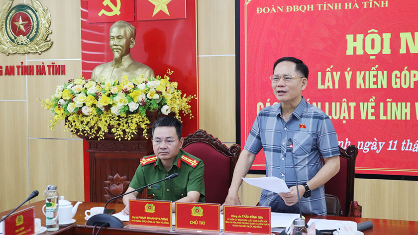 Sáng 11/10, Đoàn ĐBQH tỉnh Hà Tĩnh làm việc với Công an tỉnh về một số dự án luật về lĩnh vực an ninh, trật tự trình kỳ họp thứ 8, Quốc hội khoá XV. Phó trưởng đoàn chuyên trách Đoàn Đại biểu Quốc hội Trần Đình Gia và Đại tá Phạm Thanh Phương - Phó Giám đốc Công an tỉnh chủ trì buổi làm việc
