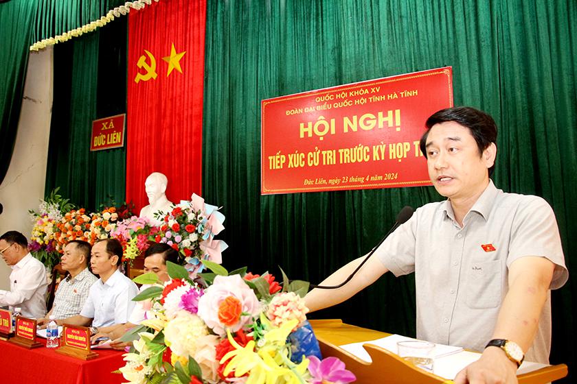 Tiếp tục chương trình tiếp xúc cử tri trước kỳ họp thứ 7, Quốc hội khóa XV, sáng 23/4/2024, Phó Trưởng đoàn ĐBQH tỉnh Trần Đình Gia và Phó Chủ nhiệm Ủy ban Đối ngoại của Quốc hội Lê Anh Tuấn đã tiếp xúc với cử tri tại xã Đức Liên, huyện Vũ Quang. Cùng dự có lãnh đạo các sở: Kế hoạch Đầu tư, Ngoại vụ, Y tế, Bộ Chỉ huy Biên phòng tỉnh, Hội Liên hiệp Phụ nữ tỉnh và lãnh đạo Huyện ủy, HĐND, UBND, Ủy ban MTTQ huyện Vũ Quang.