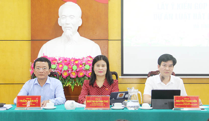 Sáng ngày 1710/2022, Đoàn đại biểu Quốc hội (ĐBQH) tỉnh đã tổ chức Hội nghị lấy ý kiến xây dựng pháp luật dự án Luật Đất đai( sửa đổi). Phó Chủ tịch HĐND tỉnh Trần Văn Kỳ, đại biểu Quốc hội Bùi Thị Quỳnh Thơ - Ủy viên chuyên trách Ủy ban Kinh tế của Quốc hội và Giám đốc Sở TN&MT Nguyễn Thanh Điện chủ trì hội nghị