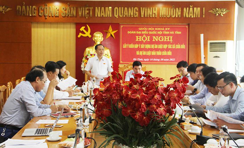 Chiều ngày 14/10/2022, Đoàn đại biểu Quốc hội (ĐBQH) tỉnh đã tổ chức Hội nghị lấy ý kiến xây dựng pháp luật dự án Luật Hợp tác xã và Luật Đấu thầu (sửa đổi). Phó trưởng đoàn chuyên trách Đoàn ĐBQH tỉnh Trần Đình Gia Phó Giám đốc Sở Kế hoạc và Đầu tư Phan Thành Biển chủ trì hội nghị.