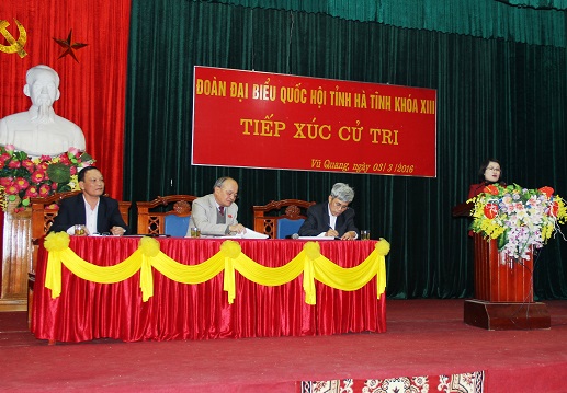Ngày 05/03/2016, Đoàn ĐBQH tỉnh đã tiếp xúc cử tri tại Hội trường UBND huyện Vũ Quang. Tham dự có các đồng chí Trần Tiến Dũng - Phó trưởng Đoàn ĐBQH tỉnh, Phạm Thị Phương - Ủy viên Ủy ban khoa học công nghệ và môi trường của Quốc hội; Dương Tất Thắng -UVBTV Tỉnh ủy, Tổng Giám đốc Tổng Công ty Khoáng sản và Thương mại Hà Tĩnh; đại diện Lãnh đạo Văn phòng Đoàn ĐBQH và HĐND tỉnh, Ủy ban MTTQ tỉnh; Ngân hành Nhà nước; Lãnh đạo Huyện ủy, HĐND, UBND, Ủy ban MTTQ huyện Kỳ Anh và Cẩm Xuyên và đông đảo cử tri.