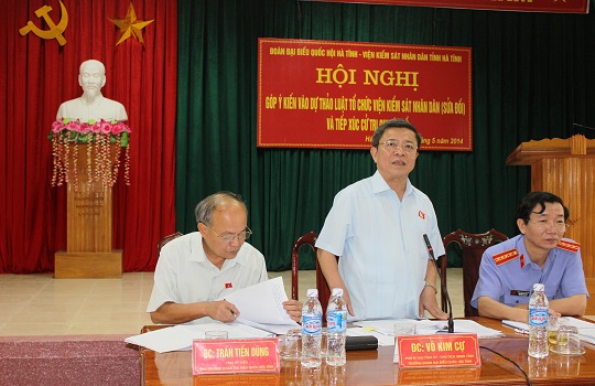 Để chuẩn bị nội dung tham gia kỳ họp thứ 7 Quốc hội khóa XIII, sáng ngày 6/5/2014, Đoàn ĐBQH tỉnh đã phối hợp với Viện kiểm sát nhân dân tỉnh tiếp xúc cử tri chuyên đề và lấy ý kiến vào dự thảo Luật tổ chức Viện kiểm sát nhân dân (sửa đổi). Tham dự và chủ trì hội nghị có đồng chí Võ Kim Cự- Phó Bí thư Tỉnh ủy, Chủ tịch UBND, Trưởng Đoàn ĐBQH tỉnh; Trần Tiến Dũng- TUV, Phó Trưởng Đoàn ĐBQH và các đại biểu Quốc hội tỉnh; lãnh đạo các ngành trong khối Nội chính.