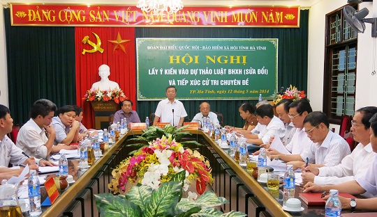 Để chuẩn bị cho kỳ họp thứ 7, Quốc hội khóa XIII sắp tới, chiều 12/5, Đoàn ĐBQH tỉnh tổ chức Hội nghị lấy ý kiến góp ý vào Luật BHXH (sửa đổi) và tiếp xúc cử tri chuyên đề với ngành BHXH. Phó Bí thư Tỉnh ủy, Chủ tịch UBND tỉnh, Trưởng Đoàn ĐBQH tỉnh - Võ Kim Cự chủ trì buổi làm việc.