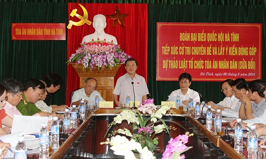 Để chuẩn bị nội dung tham gia kỳ họp thứ 7 Quốc hội khóa XIII, chiều ngày 6/5/2014, Đoàn ĐBQH tỉnh đã phối hợp với Tòa án nhân dân tỉnh tiếp xúc cử tri chuyên đề và lấy ý kiến vào dự thảo Luật tổ chức Tòa án nhân dân (sửa đổi). Tham dự và chủ trì hội nghị có đồng chí Võ Kim Cự- Phó Bí thư Tỉnh ủy, Chủ tịch UBND, Trưởng Đoàn ĐBQH tỉnh; Trần Tiến Dũng- TUV, Phó Trưởng Đoàn ĐBQH và các đại biểu Quốc hội tỉnh; lãnh đạo các ngành trong khối Nội chính.