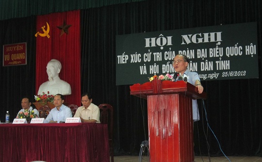 Ngày 25/6, Chủ tịch Quốc hội Nguyễn Sinh Hùng và Đoàn đại biểu Quốc hội Hà Tĩnh đã có các buổi tiếp xúc với cử tri huyện Vũ Quang và đại diện cử tri tỉnh Hà Tĩnh tại Thành phố Hà Tĩnh. Tham dự buổi tiếp xúc có Chủ nhiệm Văn phòng Quốc hội Nguyễn Hạnh Phúc, Bí thư tỉnh ủy, Chủ tịch HĐND tỉnh Nguyễn Thanh Bình và các đồng chí trong Ban thường vụ Tỉnh ủy