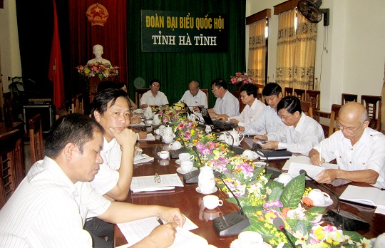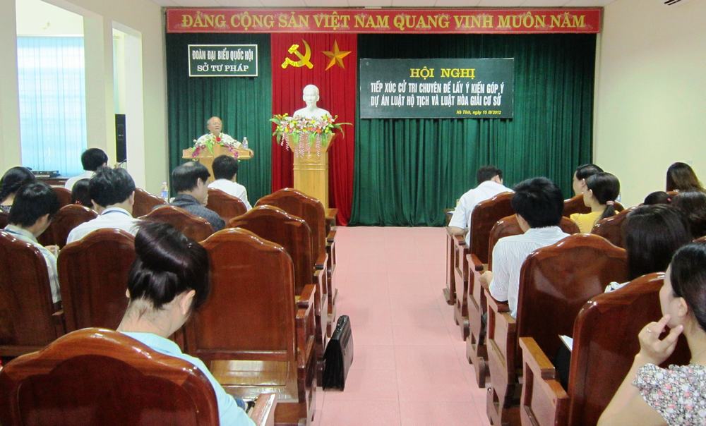 Thực hiện chương trình xây dựng pháp luật 6 tháng cuối năm 2012 của Quốc hội, ngày 15/8/2012, Đoàn Đại biểu Quốc hội tỉnh phối hợp với sở Tư pháp tổ chức hội nghị tiếp xúc cử tri chuyên đề để lấp ý kiến góp ý vào dự thảo dự án Luật hộ tịch và dự án Luật hòa giải ở cơ sở. Tham dự buổi làm việc có đại diện Thường trực UBMT Tổ quốc tỉnh, Lãnh đạo sở Tư pháp, trưởng phòng chuyên môn thuộc sở, trưởng phòng tư pháp các đơn vị: thành phố Hà Tĩnh, Kỳ Anh, Thạch Hà, Nghi Xuân, Đức Thọ và cán bộ tư pháp một số xã tiêu biểu. Đồng chí Trần Tiến Dũng, TUV, Phó trưởng Đoàn ĐBQH chủ trì buổi làm việc.