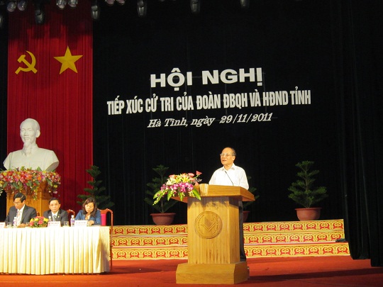 Ngày 29/11/2011, đồng chí Nguyễn Sinh Hùng - Ủy viên Bộ Chính trị, Chủ tịch Quốc hội khóa XIII và các đại biểu Đoàn ĐBQH Hà Tĩnh đã tiếp xúc với cử tri tại Thành phố Hà Tĩnh. Tham dự cuộc tiếp xúc có các đồng chí trong Văn phòng Quốc hội, Chủ nhiệm, Phó chủ nhiệm các Ủy ban Quốc hội. Về phía tỉnh có đồng chí Nguyễn Thanh Bình - Ủy viên BCH TƯ Đảng, Bí thư Tỉnh ủy, Chủ tịch HĐND, các đồng chí Ủy viên Ban Chấp hành Đảng bộ tỉnh, Thường trực HĐND, UBND, UBMTTQ tỉnh; Trưởng, Phó các Sở, Ban, Ngành, Đoàn thể; Thường trực Huyện ủy, Thành ủy, Thị ủy, Đảng ủy trực thuộc, Chủ tịch HĐND, Chủ tịch UBMTTQ cấp huyện, thành phố, thị xã và đông đảo cử tri thành phố Hà Tĩnh.