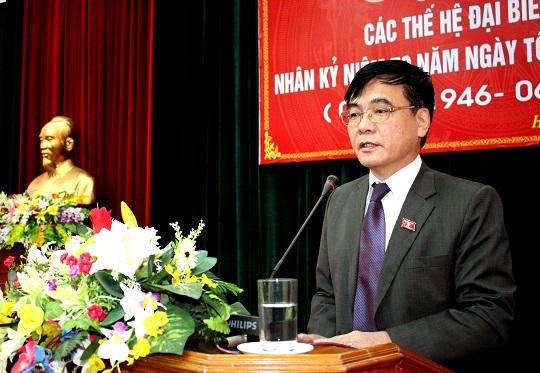 Phát biểu tại hội nghị đồng chí Trần Tiến Dũng - Phó Trưởng Đoàn ĐBQH tỉnh đã khái quát quá trình hình thành, phát triển của Quốc hội Việt Nam 70 năm qua (từ 1946 - 2016) và một số đóng góp của Đoàn ĐBQH tỉnh từ khóa I đến khóa XIII. Đồng chí nhấn mạnh: Nhìn lại chặng đường 70 năm qua của Quốc hội Việt Nam chúng ta thực sự vui mừng và tự hào vì cơ quan đại biểu cao nhất của Nhân dân, cơ quan quyền lực Nhà nước cao nhất của nước Cộng hòa xã hội chủ nghĩa Việt Nam hoạt động ngày càng có hiệu lực và hiệu quả trong thực hiện nhiệm vụ, quyền hạn theo quy định của Hiến pháp và pháp luật, được Nhân dân tín nhiệm và đồng tình ủng hộ. Tính dân chủ và tính đại diện trong hoạt động của Quốc hội ngày càng được phát huy, nhất là qua các kỳ họp Quốc hội.