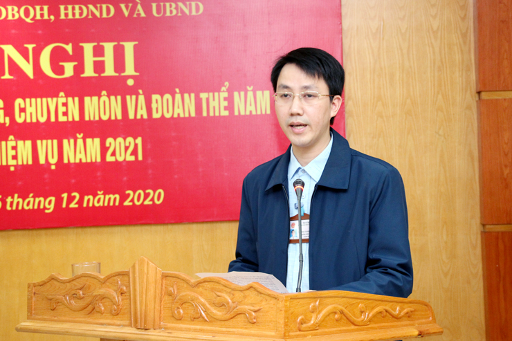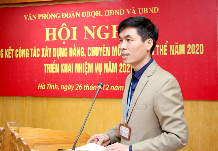 Phó Chánh Văn phòng Đoàn ĐBQH, HĐND và UBND tỉnh Phạm Xuân Phú trình bày báo cáo tổng kết công tác xây dựng Đảng, chuyên môn và Đoàn thể năm 2020; phương hướng, nhiệm vụ năm 2021.