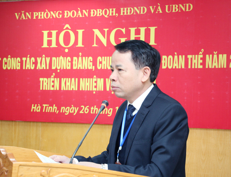 Bí thư Đảng bộ, Chánh Văn phòng Đoàn ĐBQH, HĐND và UBND tỉnh Lê Minh Đạo và Phó Chánh Văn phòng Đoàn ĐBQH, HĐND và UBND tỉnh Phạm Xuân Phú chủ trì Hội nghị. Cùng dự có lãnh đạo: Đoàn ĐBQH, Thường trực HĐND, Lãnh đạo UBND, Văn phòng Đoàn ĐBQH, HĐND và UBND; các Ban HĐND tỉnh; Ban Thường vụ Đảng ủy Khối các cơ quan và doanh nghiệp tỉnh và toàn thể đảng viên, cán bộ, công chức, viên chức, người lao động thuộc Văn phòng Đoàn ĐBQH, HĐND và UBND tỉnh.