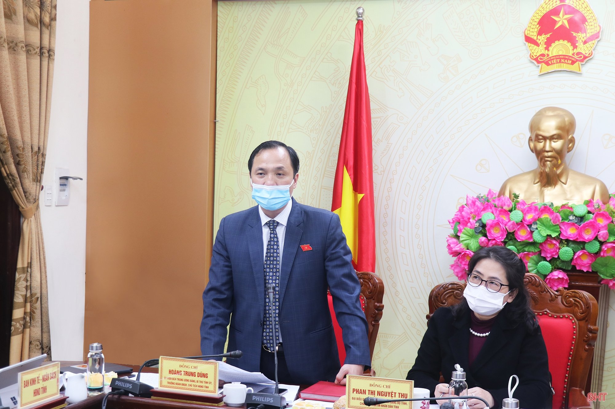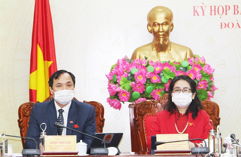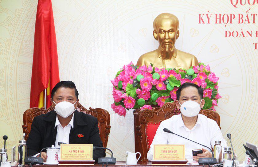 Tiếp tục kỳ họp bất thường lần thứ nhất, Quốc hội khóa XV, sáng 7/1/2021, các đại biểu thảo luận trực tuyến tại Hội trường Diên Hồng và 62 điểm cầu các tỉnh, thành phố trực thuộc Trung ương về dự thảo Nghị quyết về chính sách tài khóa, tiền tệ để hỗ trợ triển khai Chương trình phục hồi và phát triển kinh tế-xã hội. Đồng chí Bí thư Tỉnh ủy, Trưởng đoàn ĐBQH tỉnh Hoàng Trung Dũng và Phó Trưởng đoàn chuyên trách Đoàn ĐBQH tỉnh Trần Đình Gia chủ trì điểm cầu Hà Tĩnh