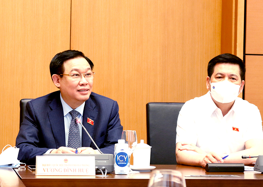 Chủ tịch Quốc hội Vương Đình Huệ, Chánh Văn phòng Trung ương Đảng Lê Minh Hưng, Bí thư Tỉnh ủy, Trưởng Đoàn ĐBQH tỉnh Hoàng Trung Dũng cùng dự thảo luận Tổ.