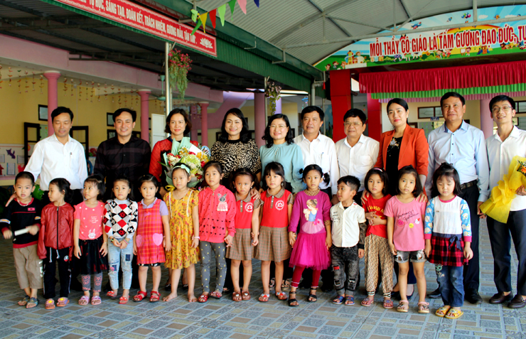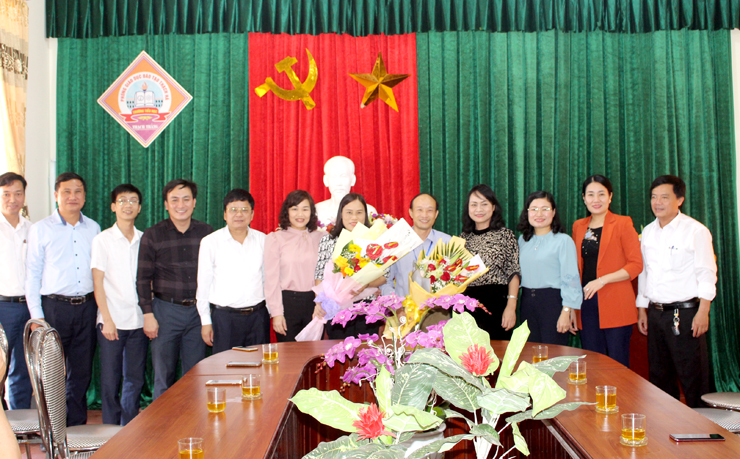 Phó Chủ tịch Thường trực HĐND tỉnh Nguyễn Thị Nữ Y tặng hoa chúc mừng tập thể cán bộ giáo viên trường Mầm non Thạch Thắng.