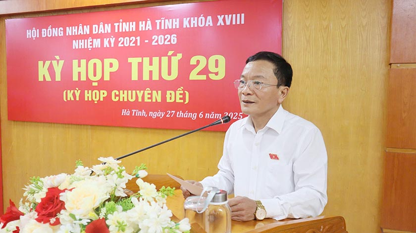 Tại kỳ họp, Giám đốc Sở Tài Chính Trịnh Văn Ngọc trình bày các tờ trình về: Sửa đổi, bổ sung một số nội dung tại Nghị quyết số 41/2021/NQ-HĐND ngày 16/12/2021 của Hội đồng nhân dân tỉnh quy định về phân cấp nguồn thu, tỷ lệ phần trăm (%) phân chia nguồn thu và phân cấp nhiệm vụ chi các cấp ngân sách địa phương giai đoạn 2022-2025; nguyên tắc, tiêu chí và định mức phân bổ chi thường xuyên ngân sách địa phương năm 2022 để áp dụng cho giai đoạn 2022-2025; Phê chuẩn quyết toán ngân sách địa phương năm 2024; Sửa đổi các Nghị quyết số 199/NQ-HĐND ngày 30/9/2024 và Nghị quyết số 212/NQ-HĐND ngày 13/12/2024 của HĐND tỉnh về danh mục các khu đất thực hiện đấu thầu dự án có sử dụng đất trên địa bàn tỉnh Hà Tĩnh năm 2024; Bổ sung kế hoạch đầu tư công năm 2025; Điều chuyển kinh phí sự nghiệp ngân sách trung ương thực hiện Chương trình mục tiêu quốc gia xây dựng nông thôn mới năm 2023; Công bố hết hiệu lực toàn bộ Nghị quyết Số 147/2019/NQ-HĐND ngày 17/7/2019 của Hội đồng nhân dân tỉnh về thu tiền bảo vệ, phát triển đất trồng lúa trên địa bàn tỉnh; Quy định thẩm quyền quyết định phê duyệt nhiệm vụ và dự toán kinh phí mua sắm, sửa chữa, cải tạo, nâng cấp tài sản, trang thiết bị; thuê hàng hóa, dịch vụ; sửa chữa, cải tạo, nâng cấp, mở rộng, xây dựng mới hạng mục công trình trong các dự án đã đầu tư xây dựng của cơ quan, đơn vị thuộc phạm vi quản lý của tỉnh Hà Tĩnh; Thông qua danh mục các khu đất thực hiện đấu thầu dự án có sử dụng đất trên địa bàn tỉnh Hà Tĩnh đợt 2 năm 2025.