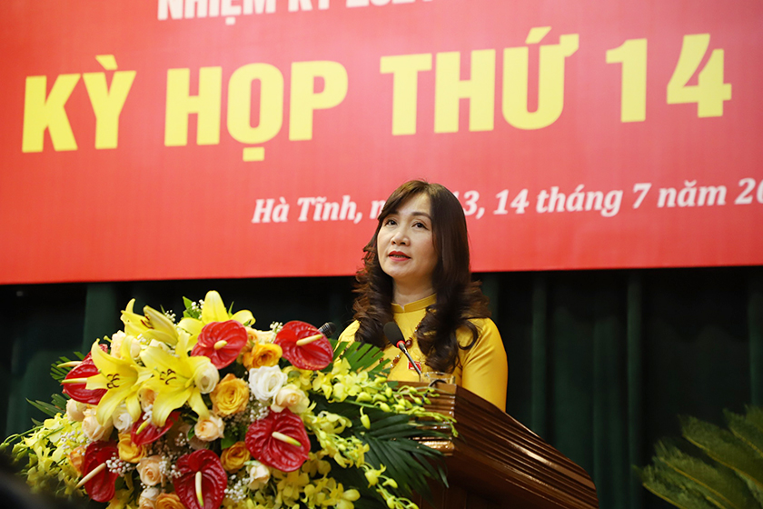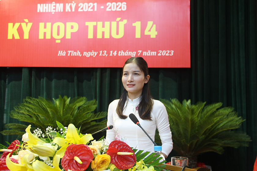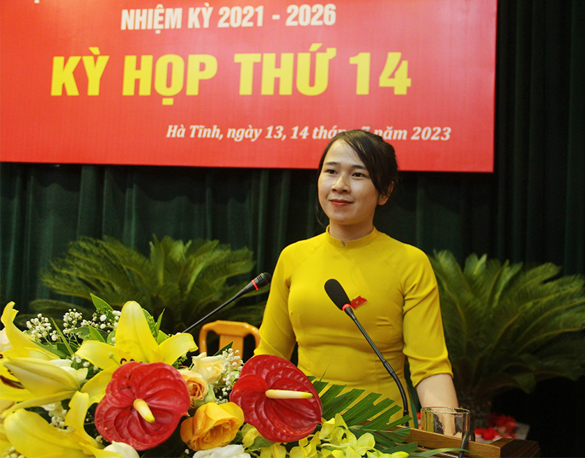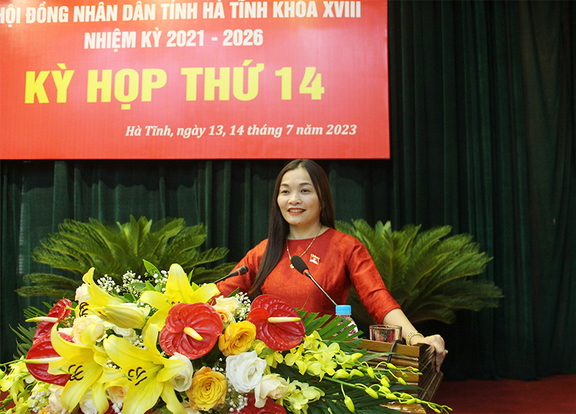 Phó Trưởng ban Thường trực Ban Tuyên giáo Tỉnh uỷ Nguyễn Thị Hà Tân (Tổ đại biểu HĐND tỉnh bầu tại huyện Can Lộc) bày tỏ sự đồng tình cao với các dự thảo nghị quyết được trình tại kỳ họp.