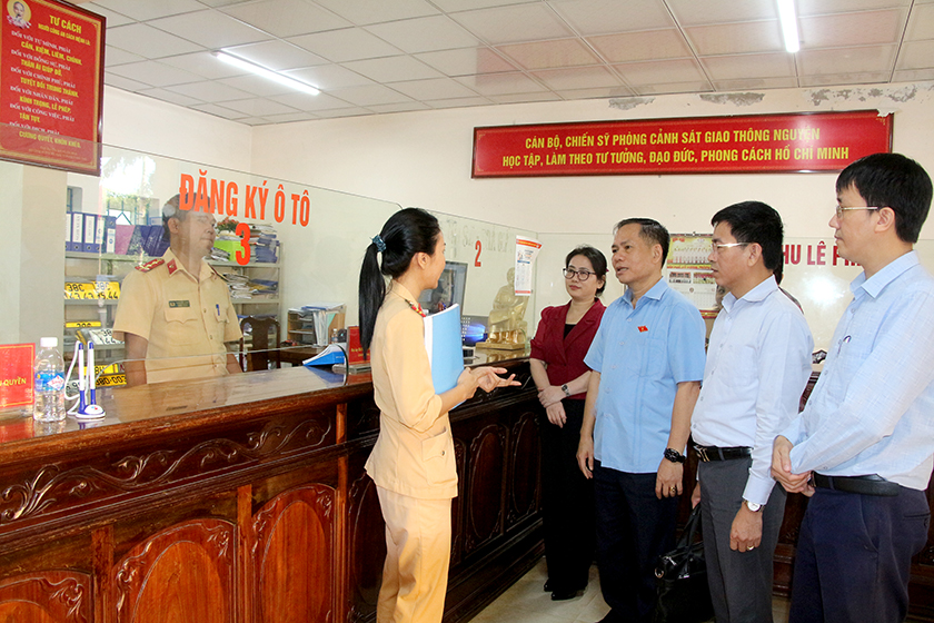 Chiều 11/10/2022, Đoàn Đại biểu Quốc hội (ĐBQH) tỉnh phối hợp Công an tỉnh tổ chức khảo sát, làm việc tại Phòng Cảnh sát Giao thông về dự thảo Nghị quyết thí điểm cấp quyền lựa chọn sử dụng biển số ô tô thông qua đấu giá. Phó Trưởng đoàn Chuyên trách Đoàn ĐBQH Trần Đình Gia và Phó Giám đốc Công an tỉnh Phạm Thanh Phương chủ trì cuộc khảo sát.