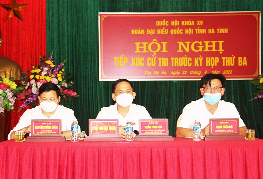 | Phó Trưởng đoàn chuyên trách Đoàn ĐBQH tỉnh Trần Đình Gia, Chủ tịch Ủy ban MTTQ huyện Nguyễn Thành Đồng và Phó Chủ tịch HĐND xã Tân Mỹ Hà Phạm Quốc Lợi chủ trì hội nghị |