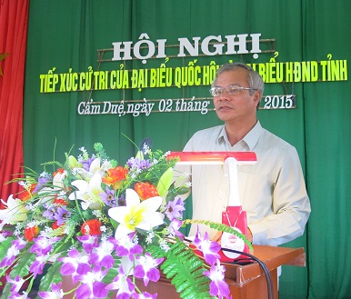 Tiếp tục chương trình tiếp xúc cử tri, ngày 02/12/2015, Đại biểu Quốc hội và Tổ đại biểu HĐND tỉnh bầu tại huyện Cẩm Xuyên đã tổ chức hội nghị tiếp xúc cử tri xã Cẩm Duệ và xã Cẩm Lộc huyện Cẩm Xuyên. Cùng tham dự tiếp xúc cử tri có đồng chí Trần Nam Hồng - BTVTU, Phó Bí thư Thường trực Tỉnh ủy; đồng chí Dương Tất Thắng - BTVTU, Tổng Giám đốc Tổng Công ty Khoáng sản và Thương Mại Hà Tỉnh; Đại diện UB MTTQ tỉnh, Văn phòng Đoàn ĐBQH và HĐND tỉnh, sở Ban ngành cấp tỉnh; Lãnh đạo Thường trực HĐND, UBND, UB MTTQ huyện Cẩm Xuyên và đông đảo cử tri.