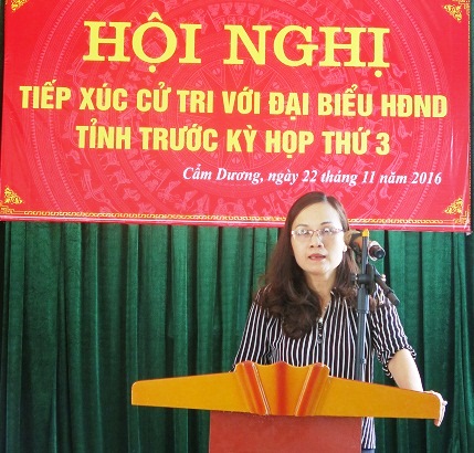 Ngày 22-23/11/2016, Tổ đại biểu HĐND tỉnh bầu tại huyện Cẩm Xuyên đã tiếp xúc cử tri tại thôn 7 xã Cẩm Minh, thôn 5 xã Cẩm Mỹ, thôn Nam Thành xã Cẩm Dương. Tham dự tiếp xúc có đại diện lãnh đạo Ban Dân vận Tỉnh ủy, Sở Y tế, Sở GT-VT, LĐLĐ tỉnh, Thường trực Huyện ủy, HĐND, UBND, các phòng chuyên môn huyện Cẩm Xuyên.