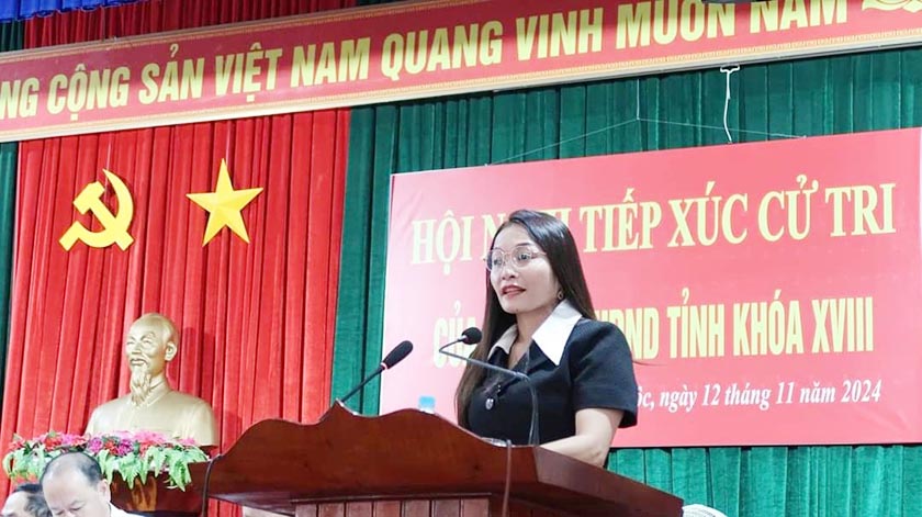 Phó Bí thư Đảng ủy Khối CCQ&DN tỉnh Nguyễn Thị Hà Tân - đại diện Tổ đại biểu HĐND tỉnh bầu tại Can Lộc báo cáo với cử tri tình hình KT-XH, QP-AN của tỉnh năm 2024