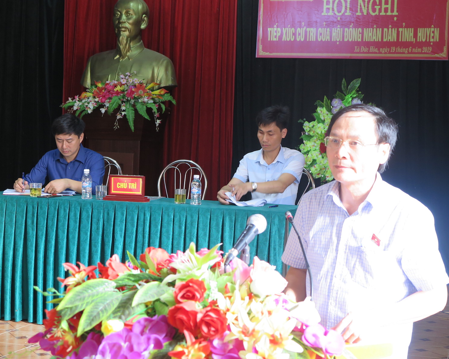 Tại buổi tiếp xúc cử tri huyện Đức Thọ đã được nghe Tổ đại biểu HĐND tỉnh bầu tại Đức Thọ báo cáo tình hình kinh tế - xã hội 6 tháng đầu năm, phương hướng, nhiệm vụ 6 tháng cuối năm 2019; báo cáo tổng hợp kết quả giải quyết kiến nghị cử tri tại kỳ họp thứ 8, HĐND tỉnh khóa XVII và các nội dung mà kỳ họp HĐND tỉnh sẽ bàn tại kỳ họp sắp tới.