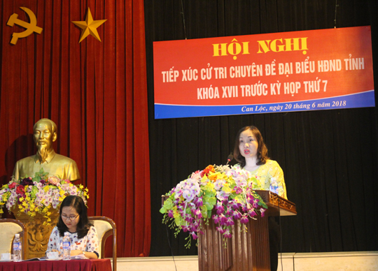 Tại hội nghị, đại biểu Nguyễn Thị Thúy Nga - Phó trưởng ban Kinh tế ngân sách HĐND tỉnh báo cáo tình hình phát triển kinh tế - xã hội của tỉnh thời gian qua; nội dung, chương trình kỳ họp; tóm tắt Đề án bảo tồn và phát huy giá trị các di sản văn hóa: Dân ca Ví, Giặm Nghệ Tĩnh, Ca Trù, Truyện Kiều, Mộc bản trường học Phúc Giang.
