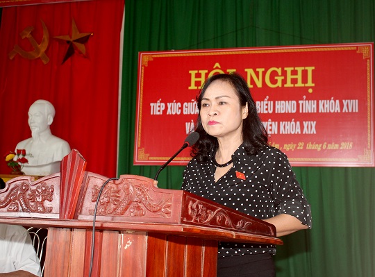 Thay mặt Tổ đại biểu HĐND tỉnh, Phó Chủ tịch HĐND tỉnh Nguyễn Thị Nữ Y đã thông tin đến cử tri kết quả phát triển kinh tế xã hội, quốc phòng - an ninh của tỉnh 6 tháng đầu năm 2018; tiếp thu, giải trình một số ý kiến, kiến nghị của cử tri. Đồng thời, Phó Chủ tịch HĐND tỉnh đề nghị huyện, các ban, ngành, đoàn thể, người dân nâng cao ý thức bảo vệ môi trường nhất là môi trường sống xung quanh; chủ động thu gom, xử lý rác thải tại từng hộ, xóm, xã; tích cực, chủ động xây dựng nông thôn mới để mỗi vùng quê trên địa bàn huyện Thạch Hà là miền quê đáng sống.