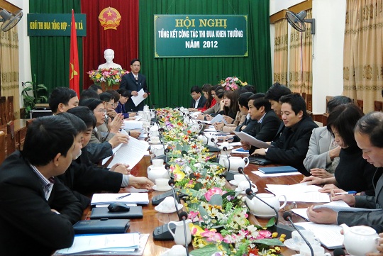 Thực hiện kế hoạch của Hội đồng thi đua khen thưởng tỉnh, sáng ngày 05/01/2013, HĐTĐ khen thưởng khối Tổng hợp - Văn xã đã tổ chức hội nghị Tổng kết thi đua năm 2012, triển khai nhiệm vụ năm 2013. Tham dự hội nghị có đồng chí Hoàng Thị Cẩm Tú, TUV, Ủy viên TT HĐND Tỉnh; đại diện lãnh đạo, cán bộ phụ trách công tác thi đua khen thưởng 14 Sở, ngành cấp tỉnh và đại diện Lãnh đạo Hội đồng thi đua khen thưởng tỉnh.