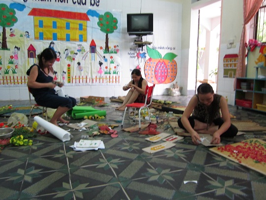 | Các cô giáo mầm non đang chuẩn bị đồ chơi cho tre |