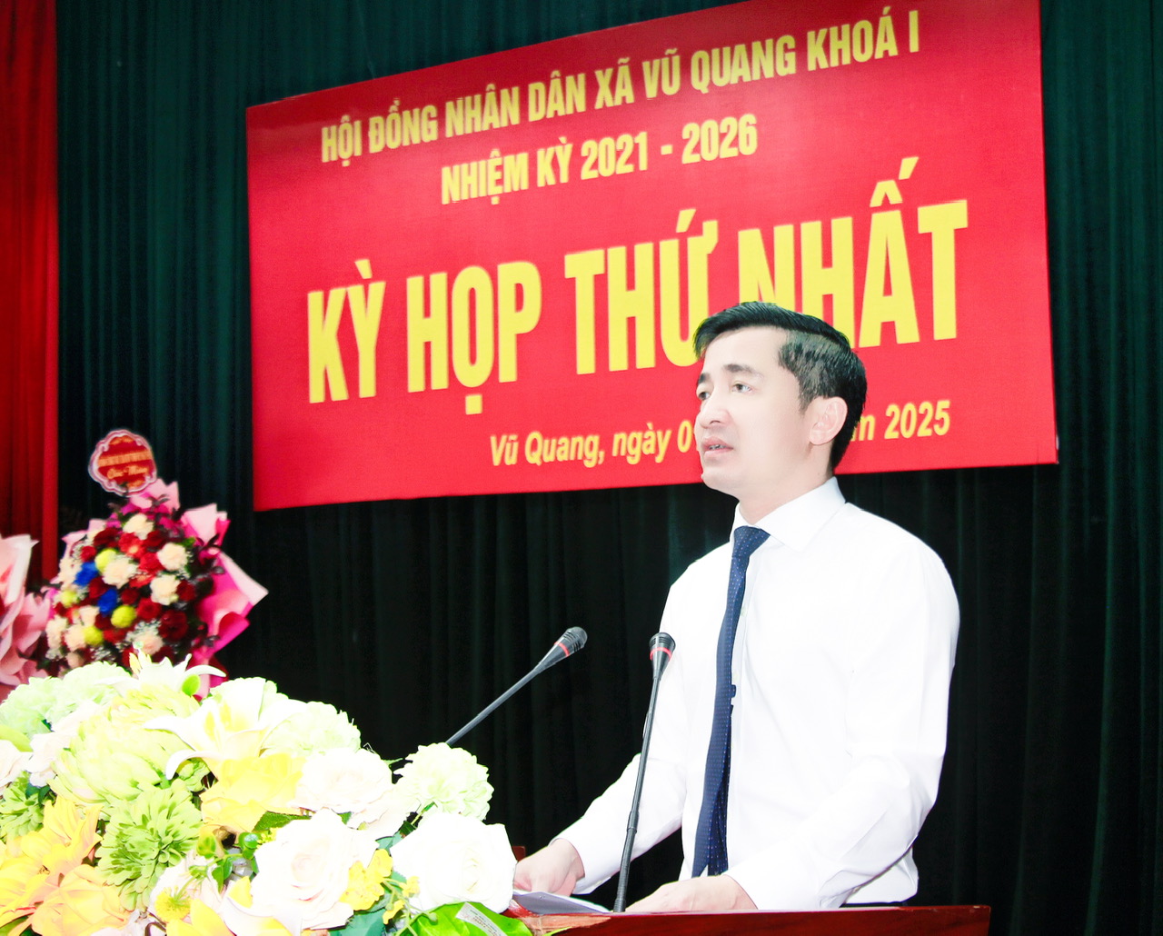 Phó Chủ tịch HĐND tỉnh Trần Văn Kỳ phát biểu tại kỳ họp thứ Nhất, HĐND xã Vũ Quang, nhiệm kỳ 2021-2026.