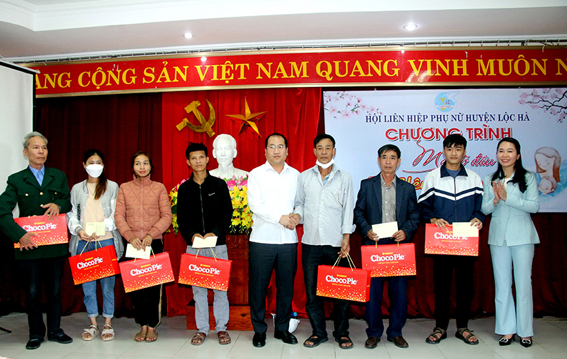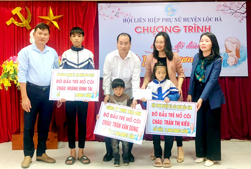Hội Liên hiệp Phụ nữ huyện Lộc Hà trao biểu tượng và số tiền ủng hộ của các nhà hảo tâm để đỡ đầu 03 trẻ mồ côi trong thời gian 03 năm.
