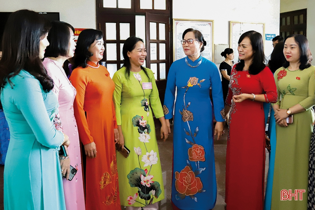 | Các Phó Chủ tịch HĐND tỉnh: Nguyễn Thị Nữ Y, Trương Thanh Huyền trao đổi với các nữ đại biểu bên lề Kỳ họp thứ 15, HĐND tỉnh khóa XVII. |